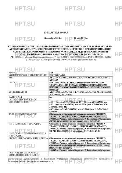 | Базовое ТС / Шасси | FIAT тип 250 (FIAT DUCATO) модификации DCMHC, CCMAC, DCMAD, DCMAC, DCMHU, CCMAU, DCMAU, DMMHC, CMMAC, DMMAD, DMMAC, DMMHU, CMMAU, DMMAU |
