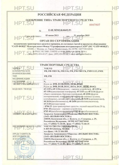 | Сборочный завод | VOLVO TRUCK CORPORATION, S-405 08 Göteborg, Sweden; VOLVO EUROPA TRUCK N.V., Smalleheerweg 31, B-9041 Gent Oostakker, Belgium |