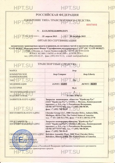 | Представитель изготовителя | Закрытое акционерное общество «Крайслер Рус» |