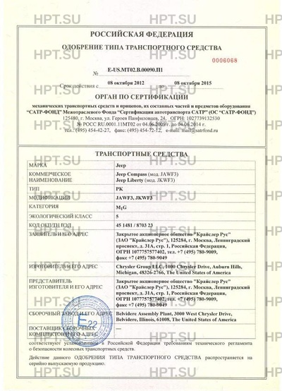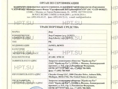 | Представитель изготовителя | Закрытое акционерное общество «Крайслер РУС», (ЗАО «Крайслер РУС»), 123317, Москва, ул. Тестовская, д. 10, блок 19-2, Российская Федерация, |