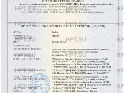 | Тип ТС | Конструкция допускает возможность передвижения шасси ТАТА, 4040.K, 4940.S (PRIME) своим ходом по дорогам общего пользования. Шасси соответствует требованиям Правил ЕЭК ООН № 105-04 (ДОПОГ) в части требований к тормозным системам в полном объеме требований Правил ЕЭК ООН № 13-11, в т.ч. приложение 5. |