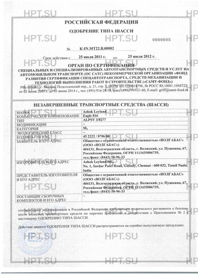 | Тип ТС | Перемещение шасси своим ходом запрещено. Символы на двух послених позициях в обозначении типа шасси зависят от комплектации и варианта исполнения шасси, различия в которых не влияют на характеристики, отраженные в Приложении № 2 к данному одобрению типа шасси и не затрагивают показателей, оцениваемых при оценке соответствия. Автобусное шасси без кузова для автобусов рамной конструкции. |