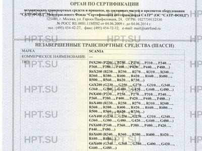 | Представитель изготовителя | Общество с ограниченной ответственностью "Скания-Русь" (ООО "Скания-Русь"). 143040, Московская область, Одинцовский район, г.Голицыно, 43-й км Минского шоссе, владение № 1, Российская Федерация. ОГРН: 1025004070079. Тел. (495) 787-5000. Факс (495) 787-5002. |