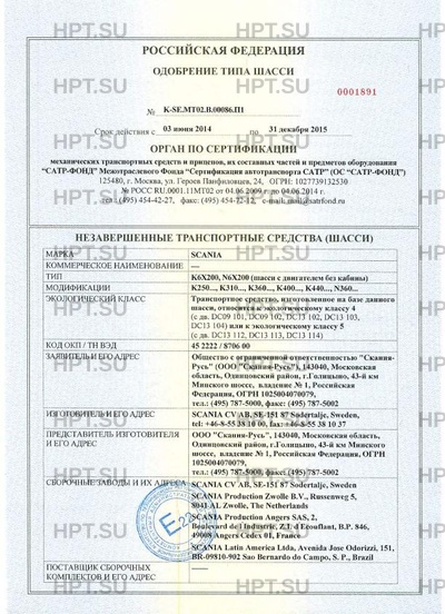 | Представитель изготовителя | Общество с ограниченной ответственностью "Скания-Русь" (ООО "Скания-Русь"). 143040, Московская область, Одинцовский район, г.Голицыно, 43-й км Минского шоссе, владение № 1, Российская Федерация. ОГРН: 1025004070079. Тел. (495) 787-5000. Факс (495) 787-5002. |