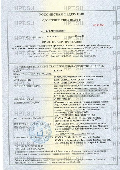| Представитель изготовителя | Общество с ограниченной ответственностью "Скания-Русь" (ООО "Скания-Русь"), 143040, Московская область, Одинцовский район, г.Голицыно, 43-й км Минского шоссе, владение № 1, Российская Федерация, ОГРН 1025004070079, тел.: (495) 787-5000, факс: (495) 787-5002. |