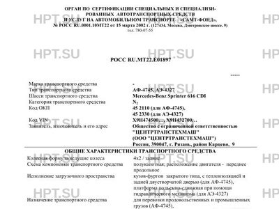 - Коммерческое наименование: АФ-4745; АЭ-4327 на шасси Мercedes-Benz Sрrinter 616 CDI