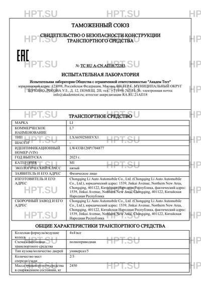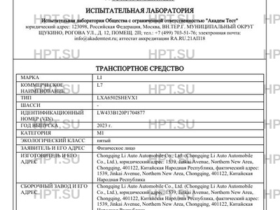Предприятие-изготовитель Chongqing Li Auto Automobile Co., Ltd. (Chongqing Li Auto Automobile Co., Ltd.), юридический адрес: 1539, Jinkai Avenue, Northern New Area, Chongqing, 401122, Китайская Народная Республика, фактический адрес: 1539, Jinkai Avenue, Northern New Area, Chongqing, 401122, Китайская Народная Республика