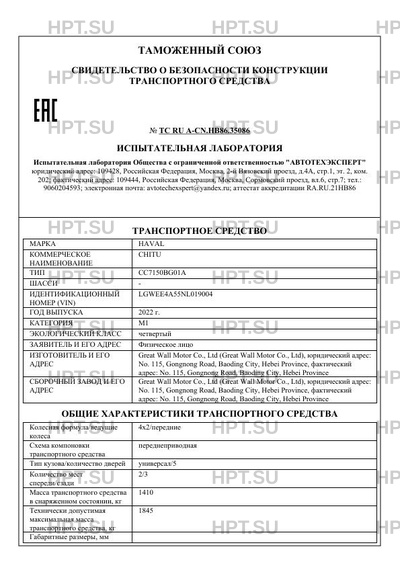 Предприятие-изготовитель Great Wall Motor Co., Ltd (Great Wall Motor Co., Ltd), юридический адрес: No. 115, Gongnong Road, Baoding City, Hebei Province, фактический адрес: No. 115, Gongnong Road, Baoding City, Hebei Province