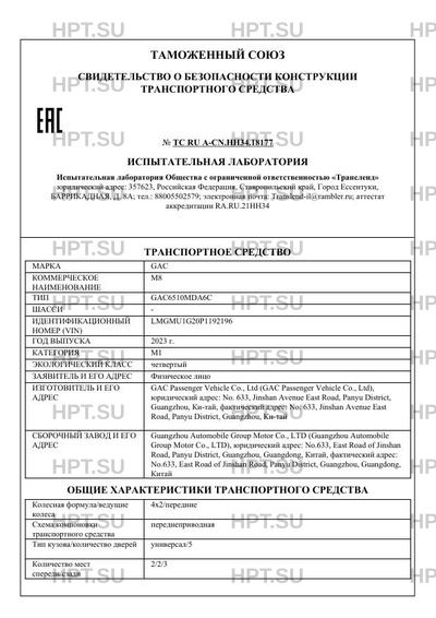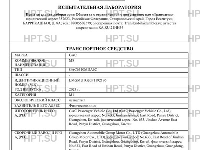 | Предприятие-изготовитель | GAC Passenger Vehicle Co., Ltd (GAC Passenger Vehicle Co., Ltd), юридический адрес: No. 633, Jinshan Avenue East Road, Panyu District, Guangzhou, Ки-тай, фактический адрес: No. 633, Jinshan Avenue East Road, Panyu District, Guangzhou, Ки-тай |