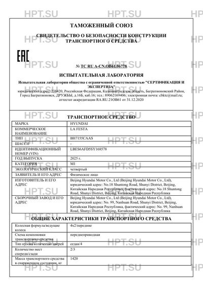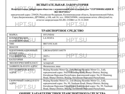 Предприятие-изготовитель Beijing Hyundai Motor Co., Ltd (Beijing Hyundai Motor Co., Ltd), юридический адрес: No.18 Shuntong Road, Shunyi District, Beijing, Китайская Народная Республика, фактический адрес: No.18 Shuntong Road, Shunyi District, Beijing, Китайская Народная Республика