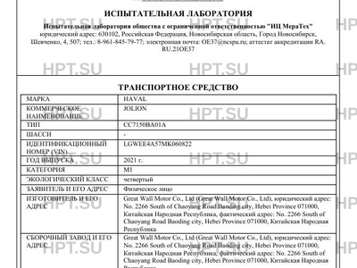 Предприятие-изготовитель Great Wall Motor Co., Ltd (Great Wall Motor Co., Ltd), юридический адрес: No. 2266 South of Chaoyang Road Baoding city, Hebei Province 071000, Китайская Народная Республика, фактический адрес: No. 2266 South of Chaoyang Road Baoding city, Hebei Province 071000, Китайская Народная Республика