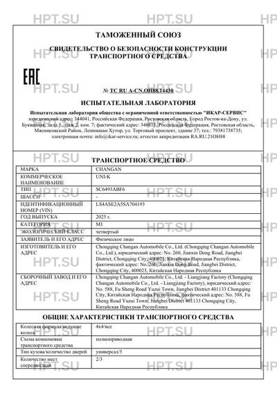 | Предприятие-изготовитель | Chongqing Changan Automobile Co., Ltd. (Chongqing Changan Automobile Co., Ltd.), юридический адрес: No. 260, Jianxin Dong Road, Jiangbei District, Chongqing City, 400023, Китайская Народная Республика, фактический адрес: No. 260, Jianxin Dong Road, Jiangbei District, Chongqing City, 400023, Китайская Народная Республика |