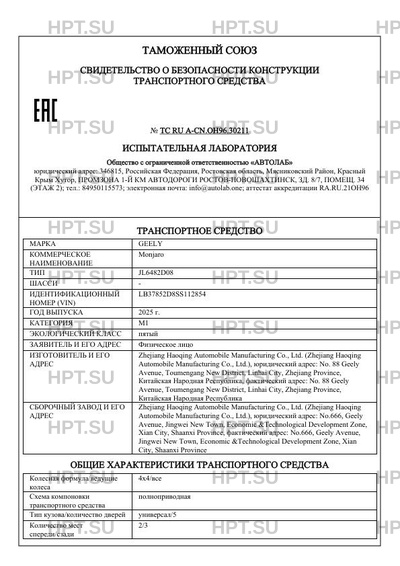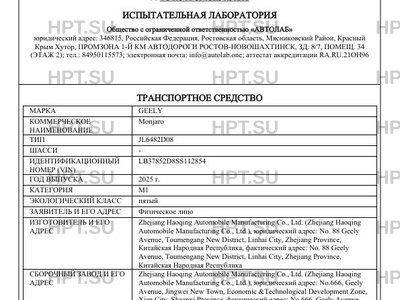 | Предприятие-изготовитель | Zhejiang Haoqing Automobile Manufacturing Co., Ltd. (Zhejiang Haoqing Automobile Manufacturing Co., Ltd.), юридический адрес: No. 88 Geely Avenue, Toumengang New District, Linhai City, Zhejiang Province, Китайская Народная Республика, фактический адрес: No. 88 Geely Avenue, Toumengang New District, Linhai City, Zhejiang Province, Китайская Народная Республика |