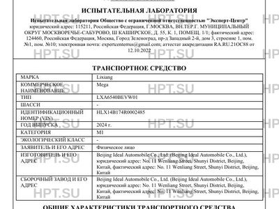 Предприятие-изготовитель Beijing Ideal Automobile Co., Ltd. (Beijing Ideal Automobile Co., Ltd.), юридический адрес: No. 11 Wenliang Street, Shunyi District, Beijing, Китай, фактический адрес: No. 11 Wenliang Street, Shunyi District, Beijing, Китай