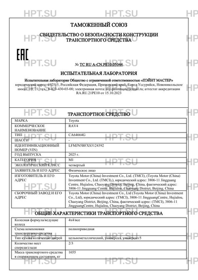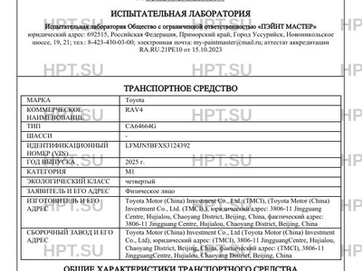 | Предприятие-изготовитель | Toyota Motor (China) Investment Co., Ltd. (TMCI), (Toyota Motor (China) Investment Co., Ltd. (TMCI),), юридический адрес: 3806-11 Jingguang Centre, Hujialou, Chaoyang District, Beijing, China, фактический адрес: 3806-11 Jingguang Centre, Hujialou, Chaoyang District, Beijing, China |