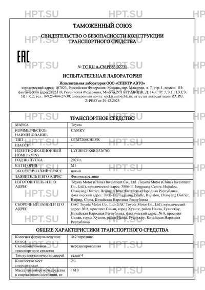 | Предприятие-изготовитель | Toyota Motor (China) Investment Co., Ltd. (Toyota Motor (China) Investment Co., Ltd.), юридический адрес: 3806-11 Jingguang Centre, Hujialou, Chaoyang District, Beijing, China, Китайская Народная Республика, фактический адрес: 3806-11 Jingguang Centre, Hujialou, Chaoyang District, Beijing, China, Китайская Народная Республика |