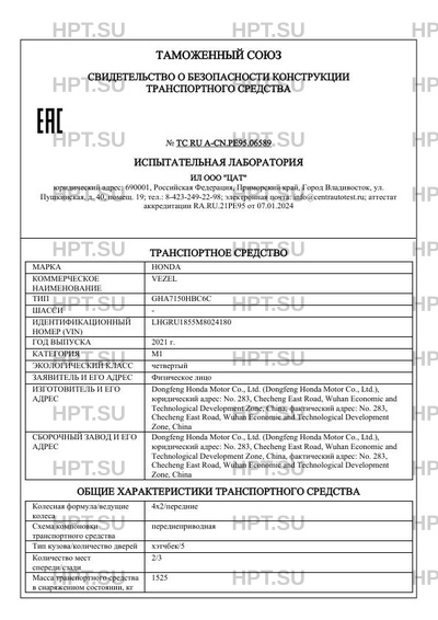 Предприятие-изготовитель Dongfeng Honda Motor Co., Ltd. (Dongfeng Honda Motor Co., Ltd.), юридический адрес: No. 283, Checheng East Road, Wuhan Economic and Technological Development Zone, China, фактический адрес: No. 283, Checheng East Road, Wuhan Economic and Technological Development Zone, China