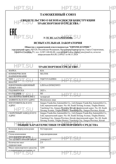 Предприятие-изготовитель Jiangsu Yueda Kia Automobile Co., Ltd (Jiangsu Yueda Kia Automobile Co., Ltd), юридический адрес: No. 68, South Xiwang Avenue, Tinghu District, Yancheng City, Jiangsu Province, Китай, фактический адрес: No. 68, South Xiwang Avenue, Tinghu District, Yancheng City, Jiangsu Province, Китай