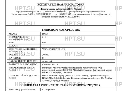 Предприятие-изготовитель Bayerische Motoren Werke AG (Bayerische Motoren Werke AG), юридический адрес: DE-80788, Mnchen, Германия, фактический адрес: DE-80788, Mnchen, Германия
