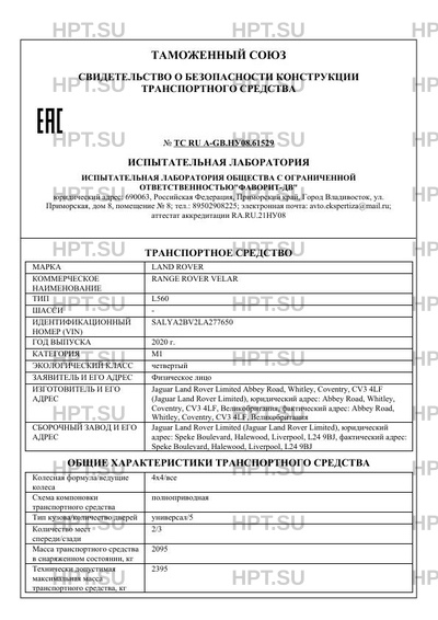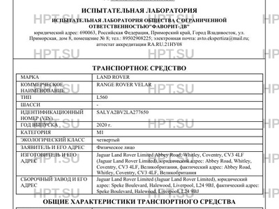 | Коммерческое наименование | RANGE ROVER VELAR |