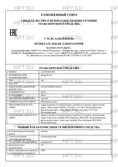 | Предприятие-изготовитель | Jaguar Land Rover Limited (Jaguar Land Rover Limited), юридический адрес: Abbey Road, Whitley, Coventry, CV3 4LF, Великобритания, фактический адрес: Abbey Road, Whitley, Coventry, CV3 4LF, Великобритания |