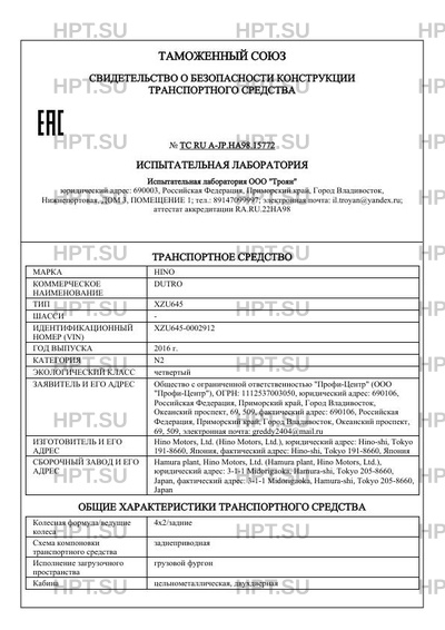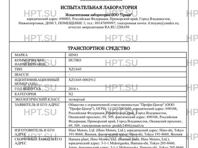 Предприятие-изготовитель Hino Motors, Ltd. (Hino Motors, Ltd.), юридический адрес: Hino-shi, Tokyo 191-8660, Япония, фактический адрес: Hino-shi, Tokyo 191-8660, Япония
