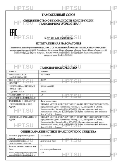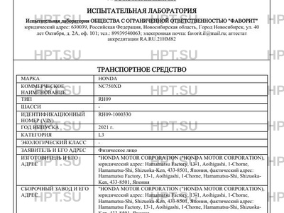 Предприятие-изготовитель "HONDA MOTOR CORPORATION ("HONDA MOTOR CORPORATION), юридический адрес: Hamamatsu Factory, 13-1, Aoihigashi, 1-Chome, Hamamatsu-Shi, Shizuoka-Ken, 433-8501, Япония, фактический адрес: Hamamatsu Factory, 13-1, Aoihigashi, 1-Chome, Hamamatsu-Shi, Shizuoka- Ken, 433-8501, Япония