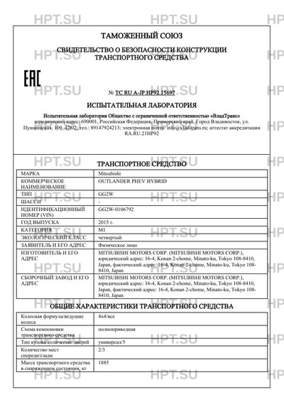| Коммерческое наименование | OUTLANDER PHEV HYBRID |