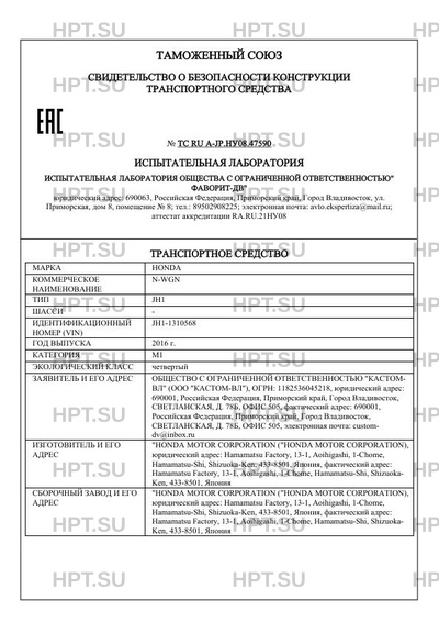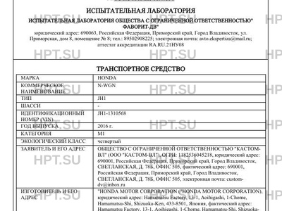 | Предприятие-изготовитель | "HONDA MOTOR CORPORATION |