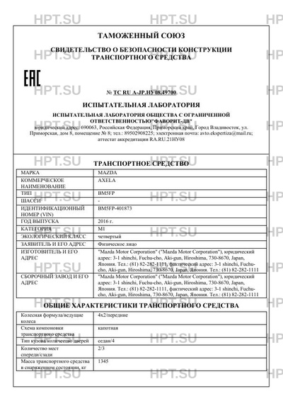 | Предприятие-изготовитель | "Mazda Motor Corporation" ("Mazda Motor Corporation"), юридический адрес: 3-1 shinchi, Fuchu-cho, Aki-gun, Hiroshima, 730-8670, Japan, Япония. Тел.: (81) 82-282-1111, фактический адрес: 3-1 shinchi, Fuchu- cho, Aki-gun, Hiroshima, 730-8670, Japan, Япония. Тел.: (81) 82-282-1111 |