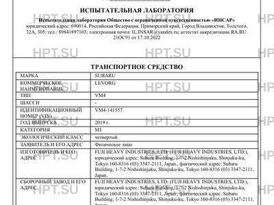 Предприятие-изготовитель FUJI HEAVY INDUSTRIES, LTD: (FUJI HEAVY INDUSTRIES, LTD:), юридический адрес: Subaru Building, 1-7-2 Nishishinjuku, Shinjuku-ku, Tokyo 160-8316 (03) 3347-2111, Japan., фактический адрес: Subaru Building, 1-7-2 Nishishinjuku, Shinjuku-ku, Tokyo 160-8316 (03) 3347-2111, Japan.