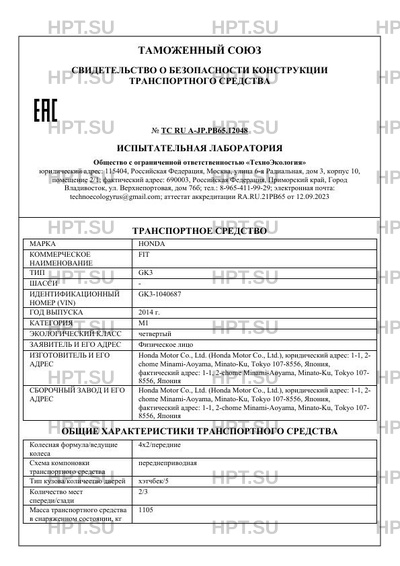 Предприятие-изготовитель Honda Motor Co., Ltd. (Honda Motor Co., Ltd.), юридический адрес: 1-1, 2- chome Minami-Aoyama, Minato-Ku, Tokyo 107-8556, Япония, фактический адрес: 1-1, 2-chome Minami-Aoyama, Minato-Ku, Tokyo 107- 8556, Япония