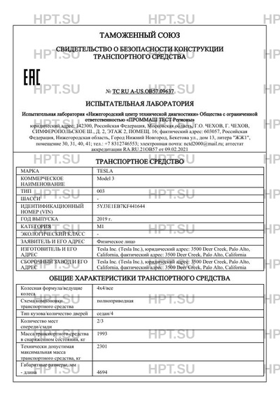 Предприятие-изготовитель Tesla Inc. (Tesla Inc.), юридический адрес: 3500 Deer Creek, Palo Alto, California, фактический адрес: 3500 Deer Creek, Palo Alto, California