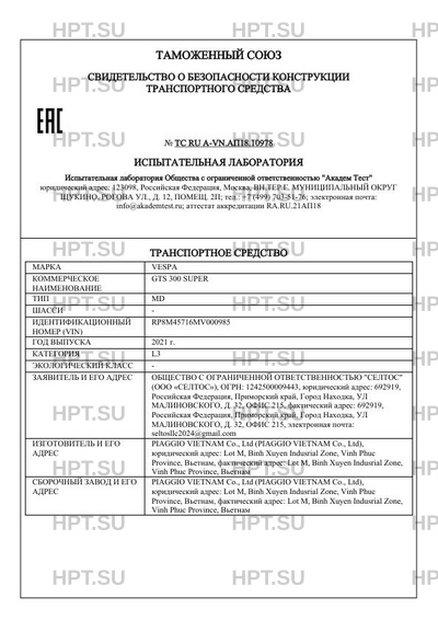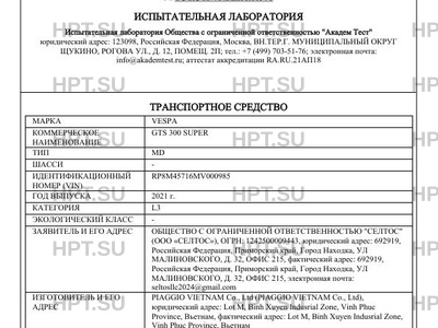 | Предприятие-изготовитель | PIAGGIO VIETNAM Co., Ltd (PIAGGIO VIETNAM Co., Ltd), юридический адрес: Lot M, Binh Xuyen Indusrial Zone, Vinh Phuc Province, Вьетнам, фактический адрес: Lot M, Binh Xuyen Indusrial Zone, Vinh Phuc Province, Вьетнам |