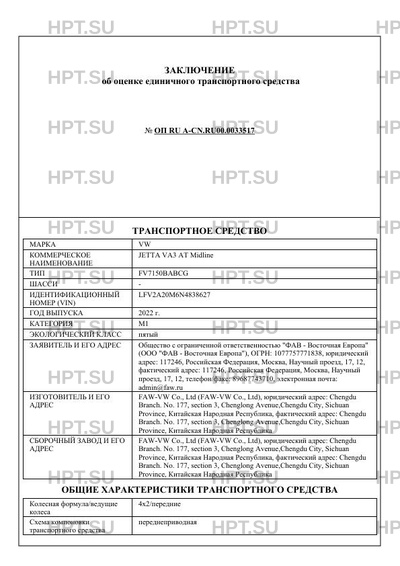 | Коммерческое наименование | JETTA VA3 AT Midline |