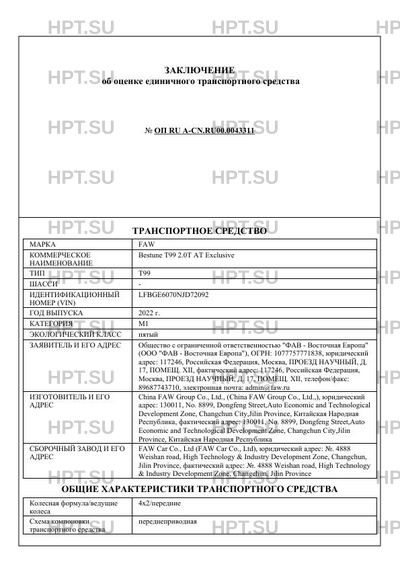 | Коммерческое наименование | Bestune T99 2.0T AT Exclusive |