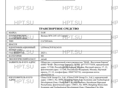 | Коммерческое наименование | Bestune B70 2.0T AT Control |