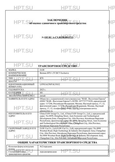 | Коммерческое наименование | Bestune B70 1.5T DCT Exclusive |