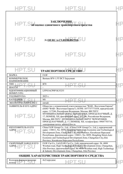 | Коммерческое наименование | Bestune B70 1.5T DCT Enjoyment |