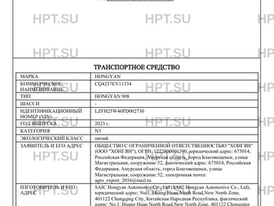 | Марка ТС | HONGYAN |