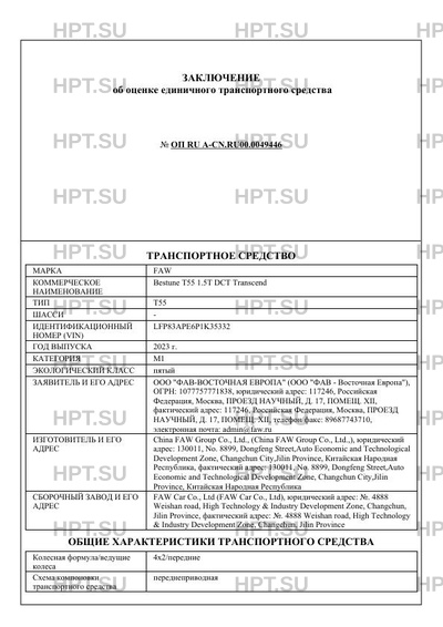 Коммерческое наименование Bestune T55 1.5T DCT Transcend