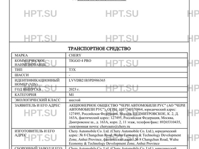 | Коммерческое наименование | TIGGO 4 PRO |