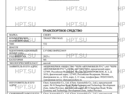 | Предприятие-изготовитель | Chery Automobile Co., Ltd. (Chery Automobile Co., Ltd.), юридический адрес: № 8 Changchun Road, Wuhu Economy and Technology Development Zone, Anhui Province, фактический адрес: № 8 Changchun Road, Wuhu Economy and Technology Development Zone, Anhui Province |