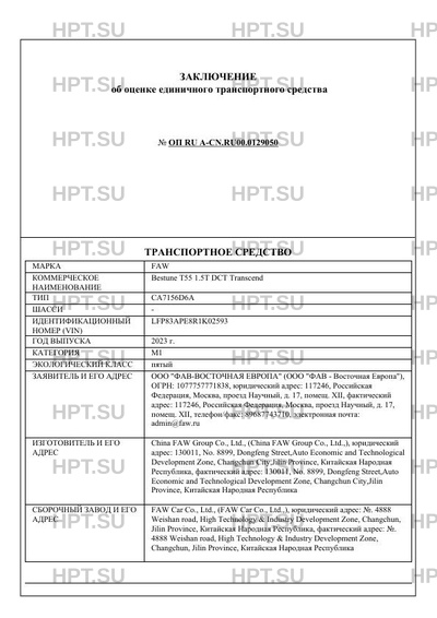 | Коммерческое наименование | Bestune T55 1.5T DCT Transcend |