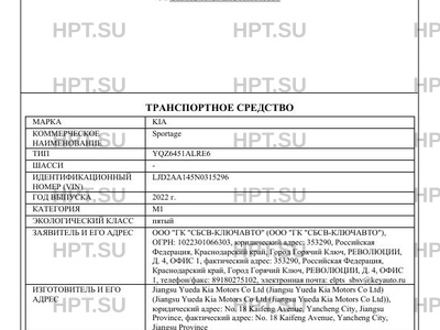 | Предприятие-изготовитель | Jiangsu Yueda Kia Motors Co Ltd (Jiangsu Yueda Kia Motors Co Ltd) (Jiangsu Yueda Kia Motors Co Ltd (Jiangsu Yueda Kia Motors Co Ltd)), юридический адрес: No. 18 Kaifeng Avenue, Yancheng City, Jiangsu Province, фактический адрес: No. 18 Kaifeng Avenue, Yancheng City, Jiangsu Province |