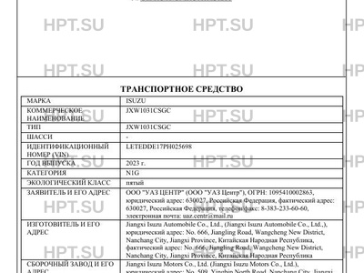 | Предприятие-изготовитель | Jiangxi Isuzu Automobile Co., Ltd., (Jiangxi Isuzu Automobile Co., Ltd.,), юридический адрес: No. 666, Jiangling Road, Wangcheng New District, Nanchang City, Jiangxi Province, Китайская Народная Республика, фактический адрес: No. 666, Jiangling Road, Wangcheng New District, Nanchang City, Jiangxi Province, Китайская Народная Республика |