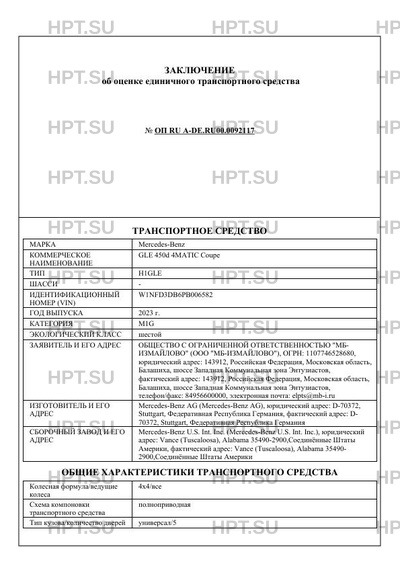 | Коммерческое наименование | GLE 450d 4MATIC Coupe |